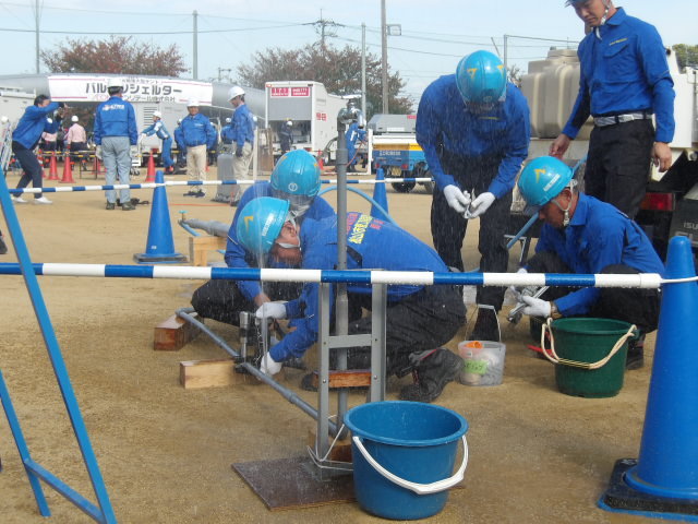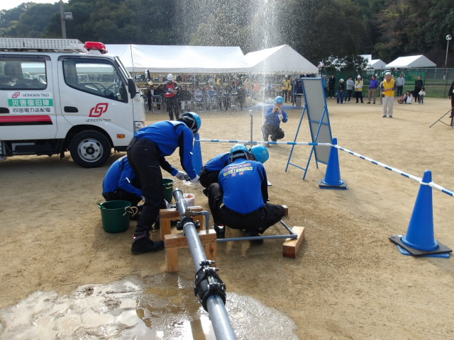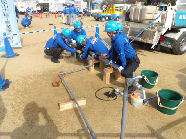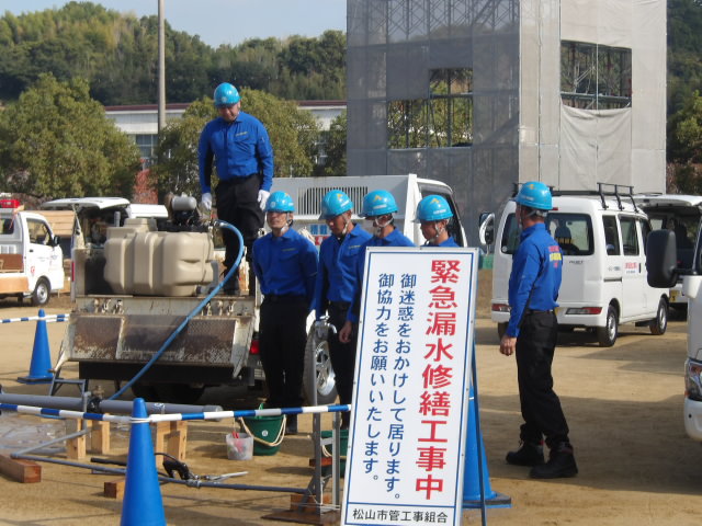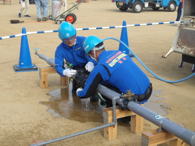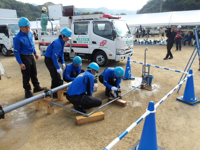 水道、ガス、電気、電話といったライフラインの復旧訓練として、当組合は安岡避難地で「水道施設応急復旧訓練」を行いました。